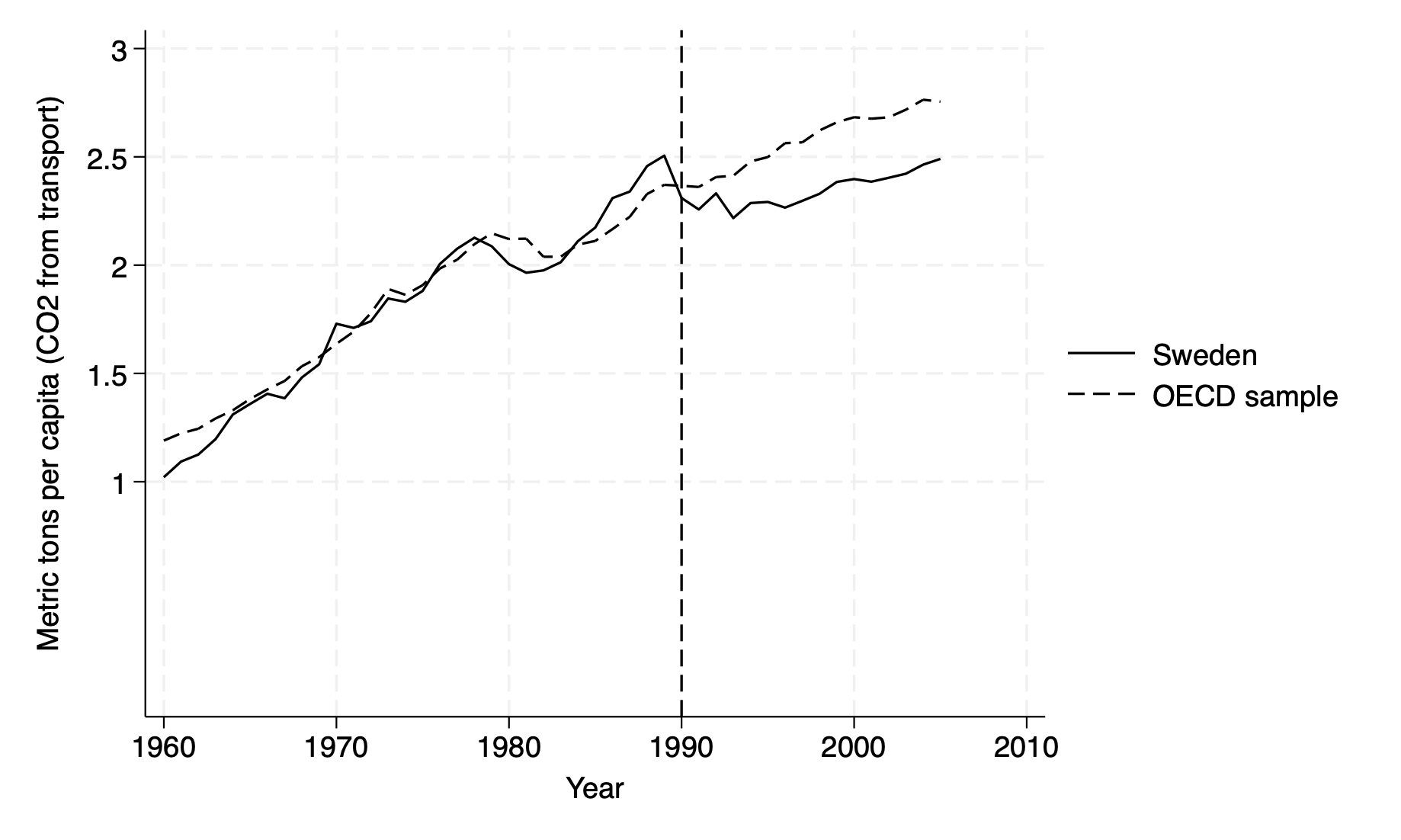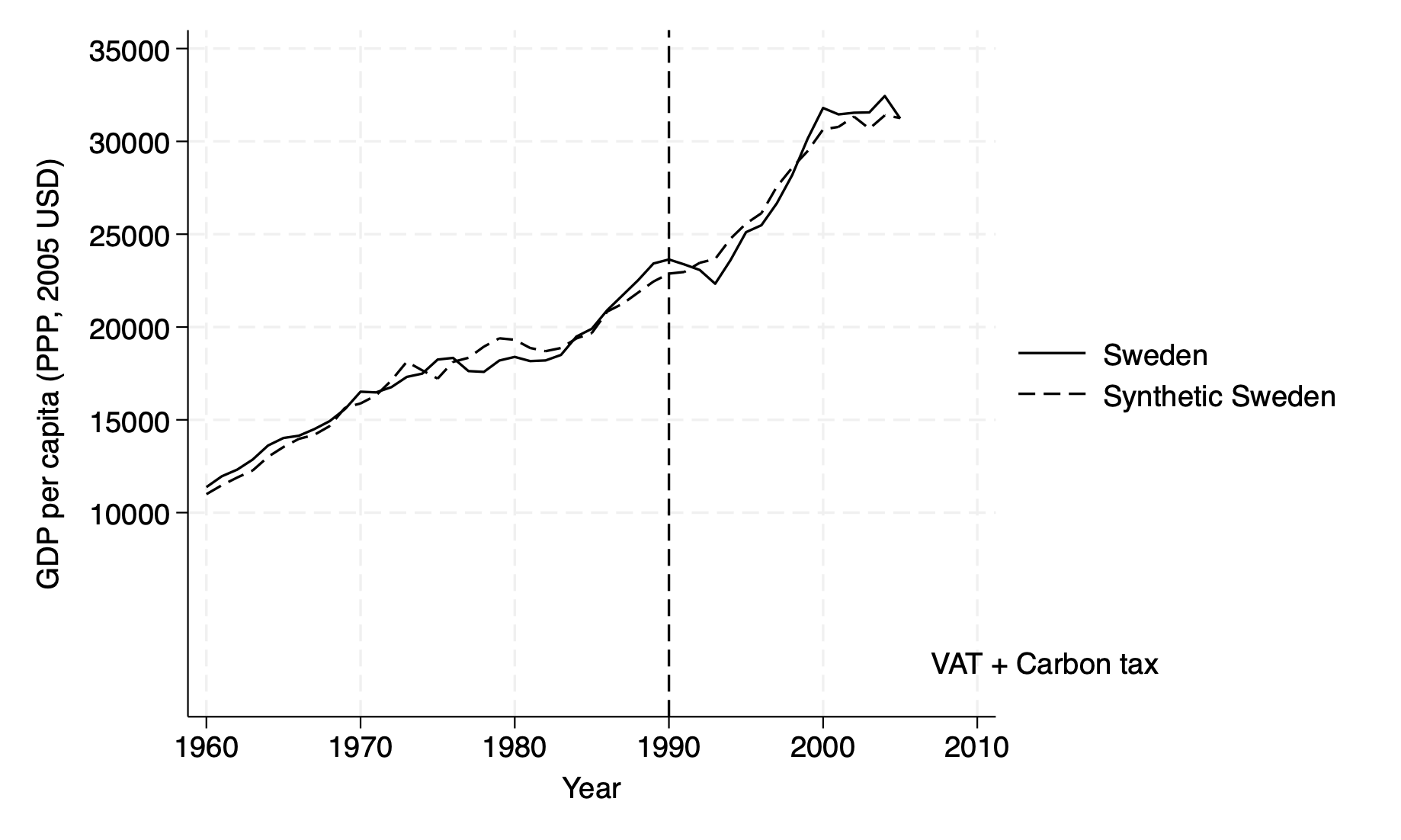 This methodology works well for comparative case studies, as it compares Sweden to other countries by creating a “synthetic Sweden”. The author does this by combining a weighted mix of OECD countries that share similar characteristics with Sweden before the tax was introduced, but that did not adopt carbon taxes themselves. This synthetic version gives a realistic counterfactual of what Sweden’s emissions may have looked like without the carbon tax.