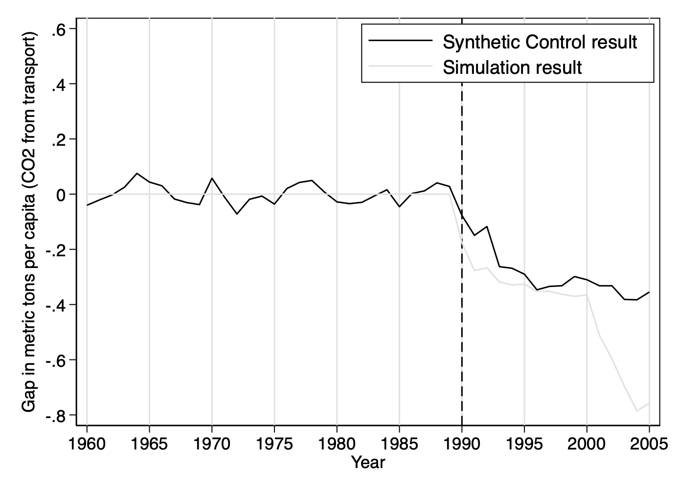 Figure 14: Gap in Per Capita CO2 Emissions from Transport: Synthetic Control versus Simulation