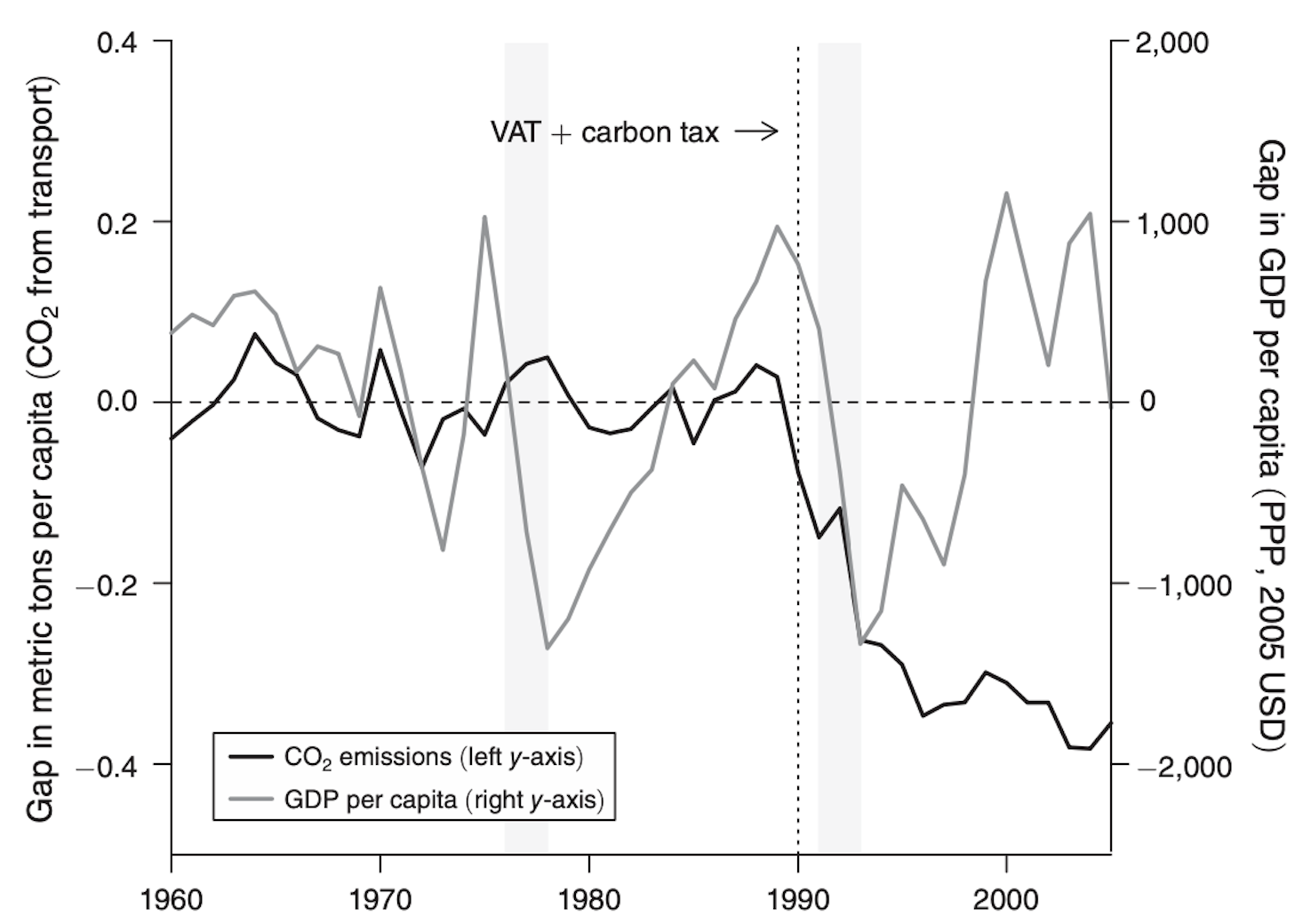 Andersson employs a quasi-experimental design within an event study framework to evaluate the policy’s impact. This approach analyzes changes in Sweden’s CO₂ emissions over time, comparing the period before and after the tax’s implementation. The study further enhances its analysis with the synthetic control method, which constructs a counterfactual scenario by combining data from other European countries that did not adopt similar policies. This synthetic control provides a benchmark to estimate what Sweden’s emissions trajectory might have been in the absence of the tax.