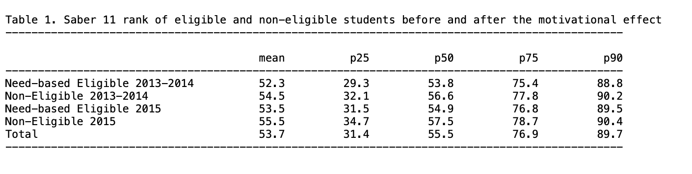 This paper analyzes the motivational effect of this scholarship on three dimensions: the students’ performances at the Saber 11, the enrollment rates in high-quality universities and the students’ performances at the Saber 9 to test for the ex-ante motivational effect.