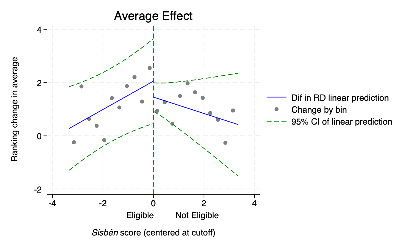 rdrobust ranking sisben if post == 1, kernel(uniform) bwselect(cersum)