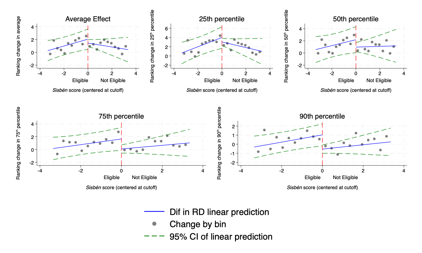 How to read Table 3? Table 3 above shows that the introduction of the scholarship Ser Pilo Paga has non-significant effect on the Saber 11 test scores at the mean, as well as at the 25th and 50th percentiles. However, looking at heterogeneity in the ranking, there are positive and statistically significant effects for the 75th and 90th percentiles, respectively. In other words, a significant gap reduction in test scores between eligible and non-eligible students can be observed at the top of the distribution of the ranking in test scores. The effect of the scholarship on the Saber 11 ranking is around 1.5 rank for eligible students. These findings are in line with the Figure 4 replicated just above.