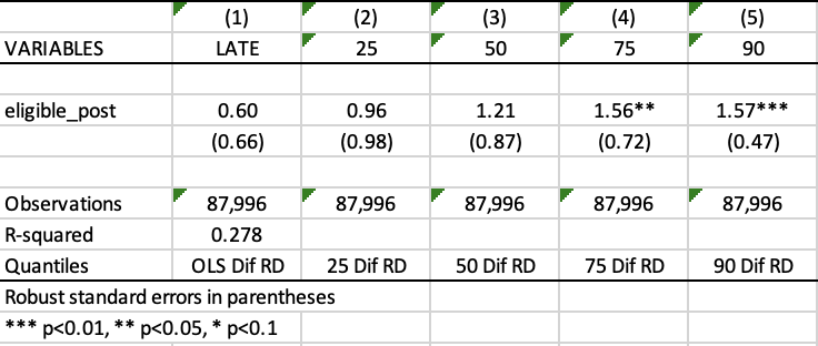 Table 3 summarizes the main results of the paper from the above equation. The first column reports the results estimated with the regression-in-discontinuities specification (mean effect) while the columns 3 to 5 report the results obtained with quantile regressions.