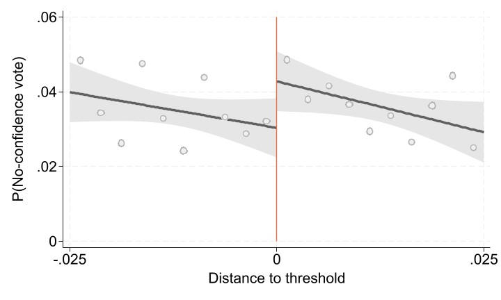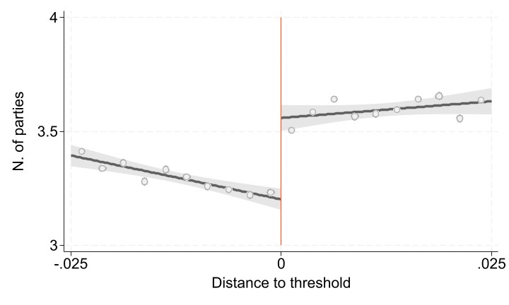 To obtain causal estimates of the effect of fragmentation – measured as the number of parties in the council – on government stability, they exploit the existence of a 5% vote-share threshold for admission to the local council. This threshold causes parties with vote-shares just below 5% to be excluded from the council, generating exogenous variation in the number of parties with representation. Results show that each additional party with representation in the parliament increases the probability that the incumbent government is unseated by 5 percentage points.