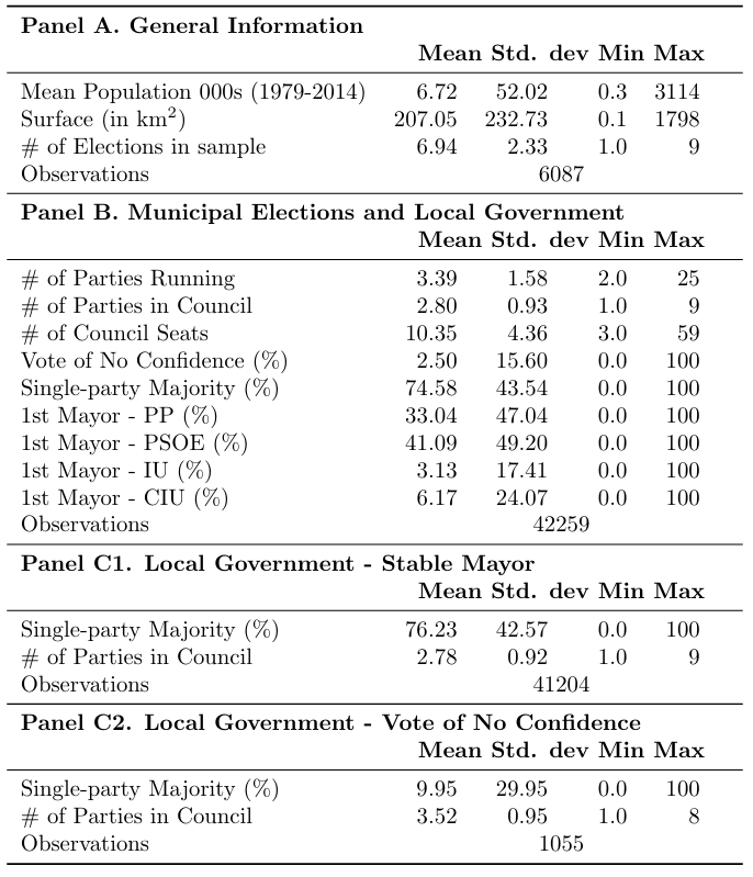 The data employed is a panel of Spanish municipalities from 1979 to 2014. The time dimension corresponds to each legislature, indexed by the year of the corresponding municipal election (1979 to 2011). The main data sources consist of electoral records, data on individual mayors and mayoral changes, municipal demographics (population, density, etc.), and data on the composition of regional and national governments. Electoral outcomes in municipal elections were obtained from the Ministry of Internal Affairs and residential registry. The sample consists of municipalities with more than 250 inhabitants for a total of 51,000 elections. The final dataset includes 42,259 elections because of additional data restrictions.