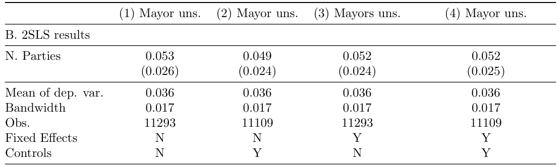 addnotes("Notes: Reduced-form and 2SLS estimates of the effect of the number of parties on the probability of unseating the mayor (equation 2). Sample restricted to elections in which the largest party receives less than 40 percent of valid votes. The dependent variable is an indicator taking value 1 if the mayor was unseated by a vote of no confidence during the legislature. Controls and FE are included as indicated in each column. Controls: surface and population (in logs). FE: number of available seats and election year fixed effects. The optimal bandwidth is calculated using the CCT method.Standard errors are clustered at the municipality level.")