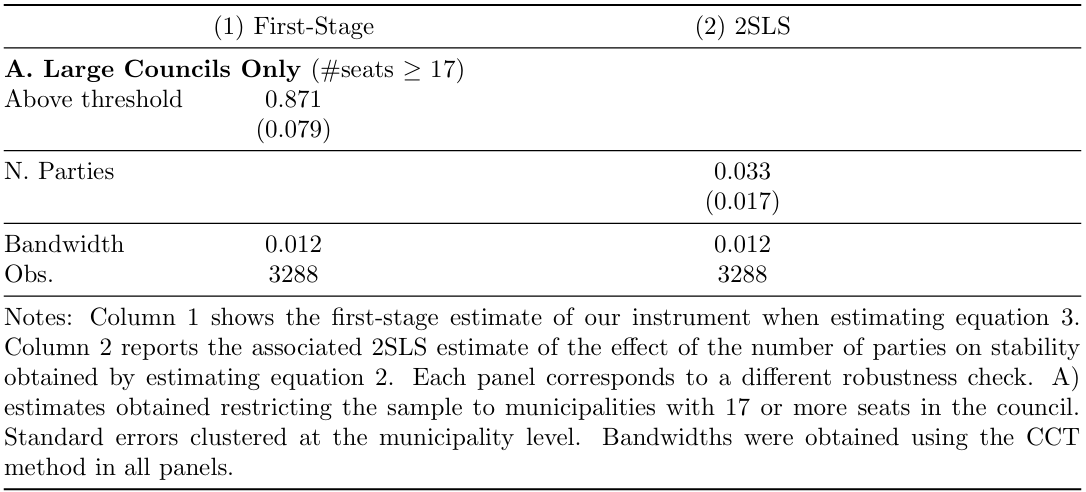 addnotes("Notes: Column 1 shows the first-stage estimate of our instrument when estimating equation 3. Column 2 reports the associated 2SLS estimate of the effect of number of parties on stability obtained by estimating equation 2. Each panel corresponds to a different robustness check: A) estimates obtained restricting the sample to municipalities with 17 or more seats in the council. Standard errors clustered at the municipality level. Bandwidths obtained using the CCT method in all panels.")