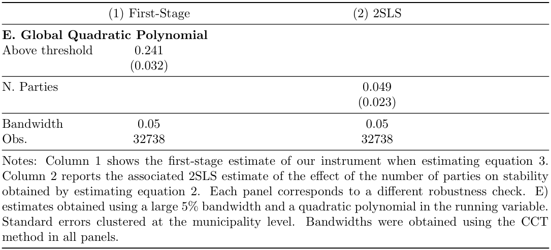 addnotes("Notes: Column 1 shows the first-stage estimate of our instrument when estimating equation 3. Column 2 reports the associated 2SLS estimate of the effect of number of parties on stability obtained by estimating equation 2. Each panel corresponds to a different robustness check: E) estimates obtained using a large 5% bandwidth and a quadratic polynomial in the running variable. Standard errors clustered at the municipality level. Bandwidths obtained using the CCT method in all panels.")