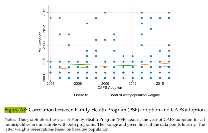 One main concern for this paper to be empirically valid is that some other policies have been impulsed in the 2000s in Brazil, notably the famous PBF and Family Health Program (Programa Saude da Familia, PSF). In the robustness section, the goal is thus to make sure that those policies did not also impact our outcomes, since it would create an upward bias. They conduct several test, goal is to know if the adoption of both programs were correlated.