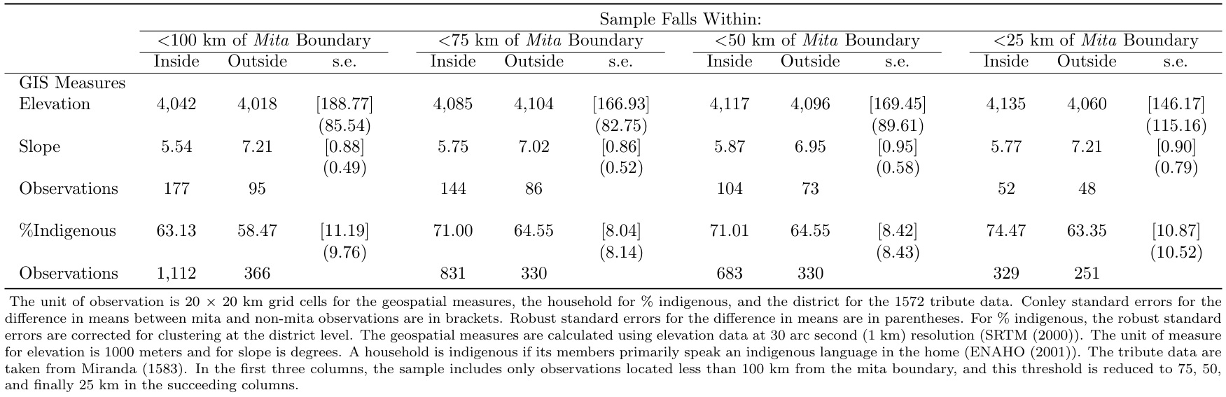 A critical assumption for the identification strategy is that all the characteristics of the treatment and control vary smoothly at the mita cutoff. Table 1 presents summary statistics for sample characteristics within and outside of the mita boundaries. Different distances from the Mita boundaries are used in the selection of observations to include in each group. Reassuringly, there are no significant differences.