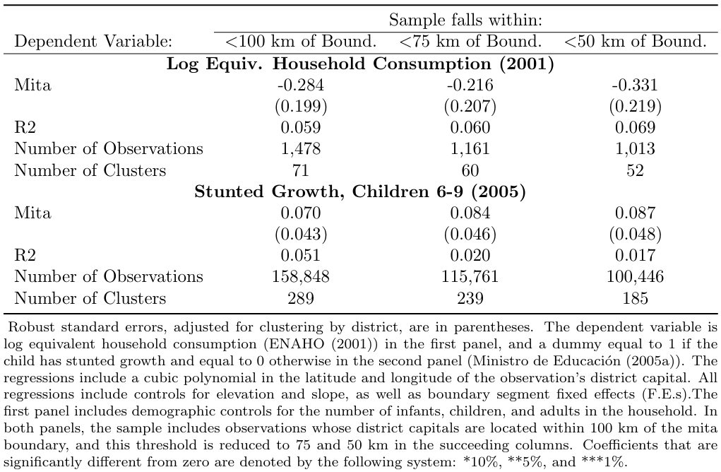 The paper is interested in the impact of Mita on both economic outcomes (household consumption) and outcomes in terms of health (stunted growth) so both results are presented in the main table with the following code.