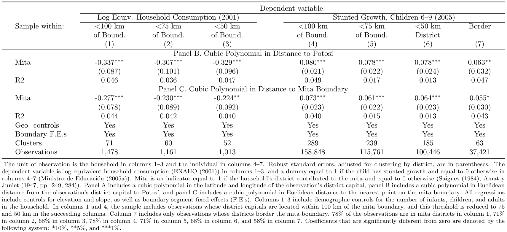 The multidimensional RD polynomial approach was a novel methodology at the time and therefore there was no empirical background able to state a priori why this strategy performs better. Given these concerns, two other single-dimension specifications were applied to examine the robustness of the findings. The first is the polynomial in distance to Potosi, which is likely to capture variation in unobservable characteristics but it is not the most precise approach in mapping RD setup. The second specification controls for a polynomial in distance to the Mita boundary, which is closer to traditional one-dimensional RD designs even if it lacks a historical explanation that states its relevancy. Looking at the results across the three specifications is not possible to reject that they are statistically identical and consequently admit the robustness of the main findings.